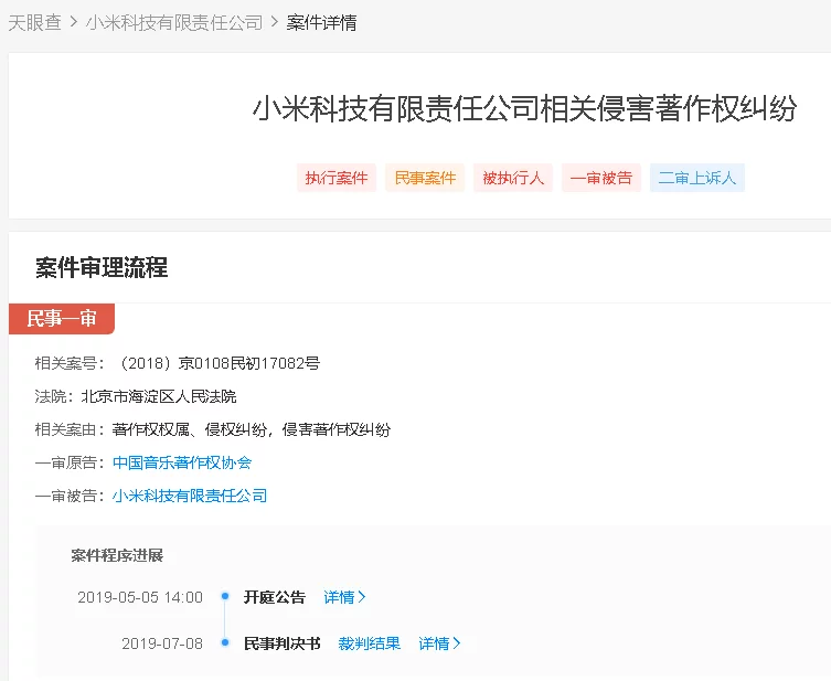 2019年,小米科技有限责任公司二审上诉中国音乐著作权协会著作权权属、侵权纠纷。法院二审认为,一审判决认定事实清楚,适用法律正确。小米公司的上诉请求缺乏事实和法律依据,法院不予支持。