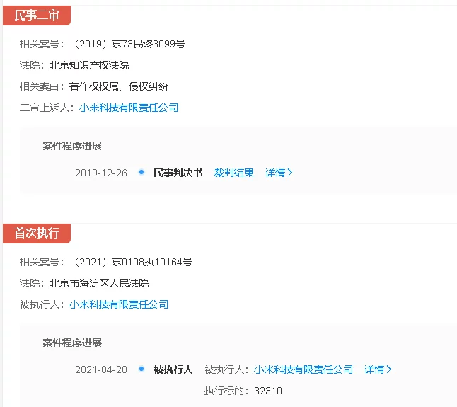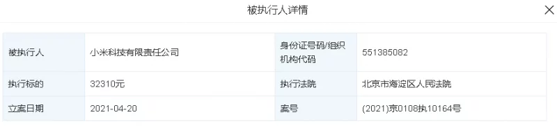 据天眼查显示,小米科技有限责任公司于4月20日因未按时履行法律义务被北京市海淀区人民法院强制执行,执行标的为32310元,涉及案号为(2021)京0108执10164号,关联案件为小米科技有限责任公司与中国音乐著作权协会的著作权纠纷。