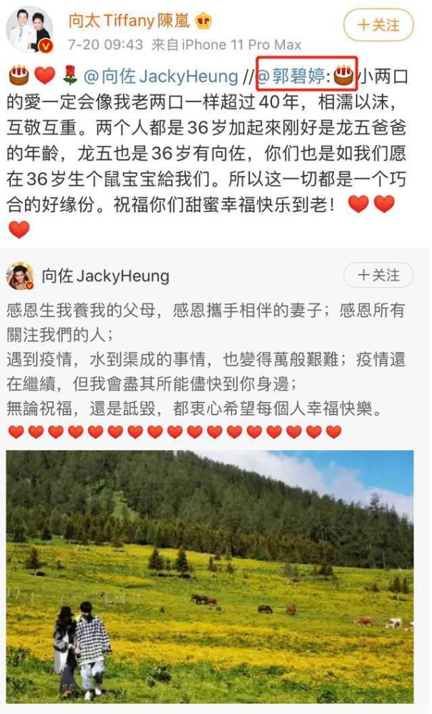 像前几次一样,公布这个消息的不是向佐或郭碧婷本人,而是作为婆婆的向太——她转发了向佐的微博,并留言确证了“小两口”如他们所愿,会生下一个“鼠宝宝”。