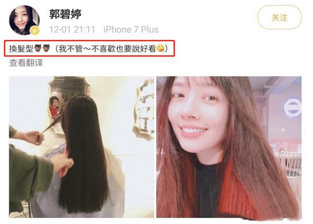 很久之前,郭碧婷在网上发布自己换了发型的信息。